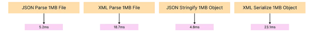在实际性能测试中,JSON 的解析速度远超 XML。以 Node.js v20 为例,JSON 的解析速度普遍比 XML 快 3 至 4 倍。在浏览器中,由于原生支持,差距更为明显。