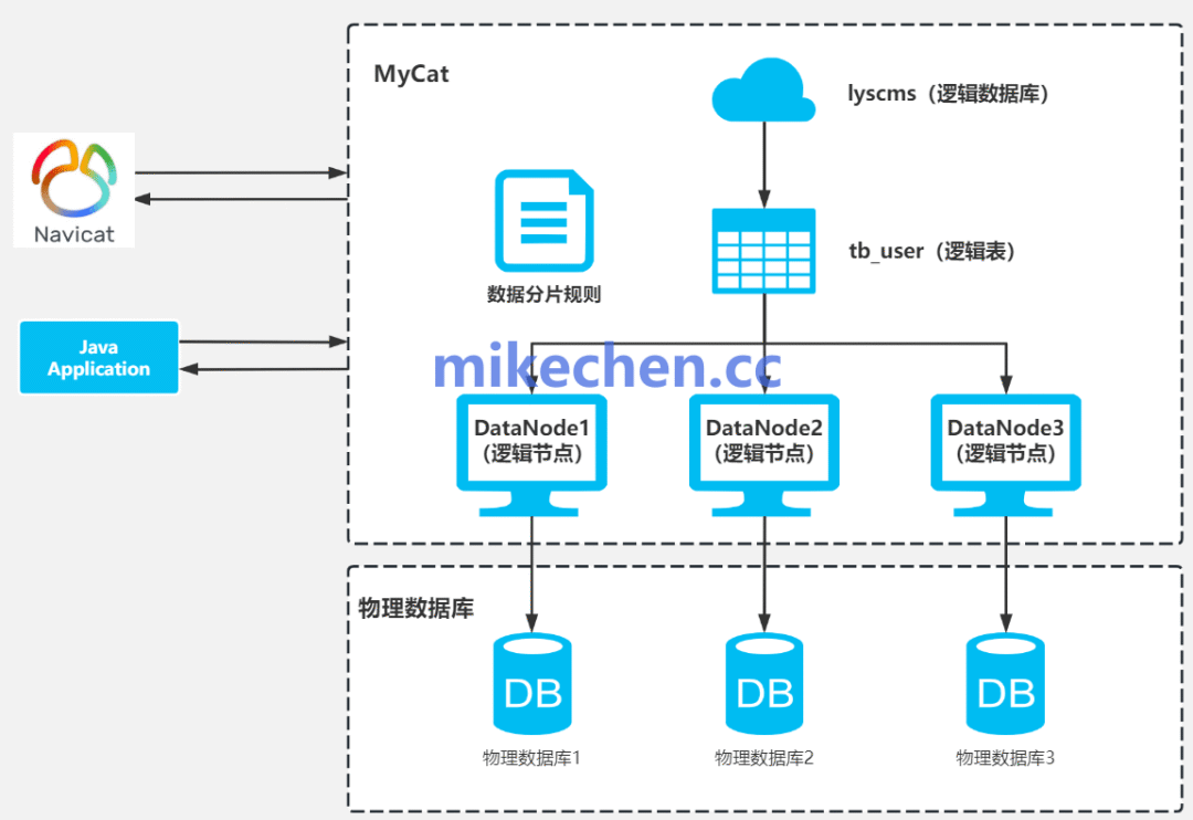 ShardingSphere 适用于各种需要分布式数据库管理的场景,比如:电商、社交网络.....等需要处理大规模数据,和高并发请求的场景。 2.TDDL TDDL,全称是Taobao Distributed Data Layer,就是:淘宝分布式数据层。 TDDL是阿里巴巴集团内部开发的一款分布式数据库中间件,设计目标是:解决在电商业务中遇到的大规模数据、和高并发请求问题。 3.DRDS 阿里的TDDL,后续升级为:DRDS,全称是“Distributed Relational Database Service”,是一款:分布式关系型数据库服务。 DRDS整体架构,如下图所示: DRDS支持:分库分表、读写分离、和分布式事务...等技术。 DRDS广泛应用于数据量大的场景,比如:电商、金融、游戏...等领域。 4.MyCAT MyCAT 是基于阿里巴巴的 Cobar 项目开发的,是一个增强版的数据库中间件,支持多种数据库(如:MySQL、PostgreSQL...)等。 整体架构,如下图所示: MyCAT 支持将数据分散到多个数据库实例、和多个表中,通过灵活的分片规则实现水平扩展。 比如: