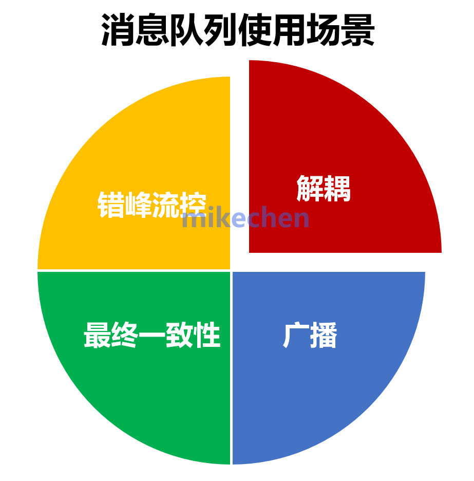 二、MQ消息队列的技术应用1.解耦 解耦是消息队列要解决的最本质问题。 2.最终一致性 最终一致性指的是两个系统的状态保持一致,要么都成功,要么都失败。 最终一致性不是消息队列的必备特性,但确实可以依靠消息队列来做最终一致性的事情。 2.广播 消息队列的基本功能之一是进行广播。 有了消息队列,我们只需要关心消息是否送达了队列,至于谁希望订阅,是下游的事情,无疑极大地减少了开发和联调的工作量。 3.错峰与流控 典型的使用场景就是秒杀业务用于流量削峰场景。 由于篇幅的关系,本文重点介绍消息队列比较,详细应用场景可参考我的往期文章《什么是流量消峰?如何解决秒杀业务的削峰场景》。