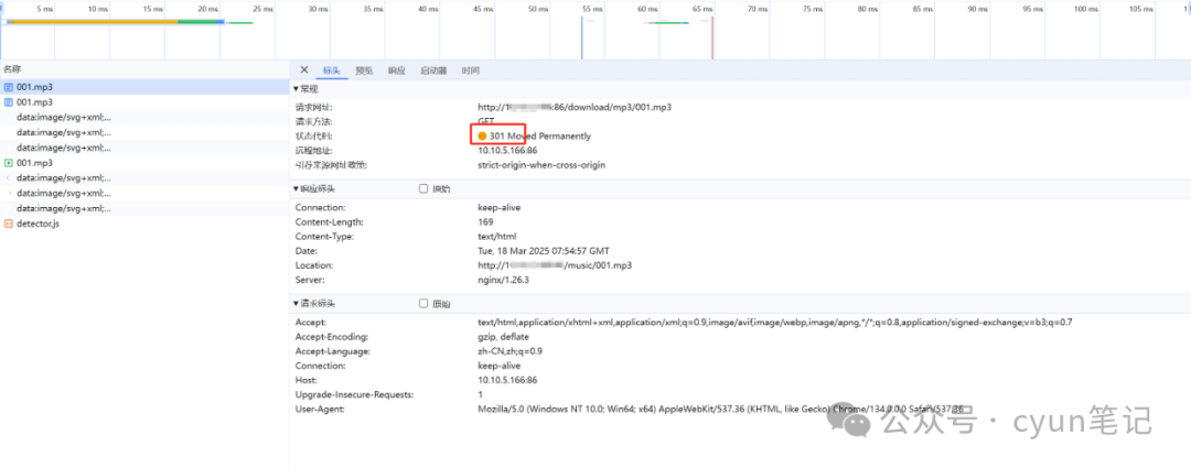 ,响应:301 http://192.168.1.166:86/music/001.mp3