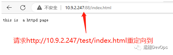 此时通过浏览器请求http://10.9.2.247/test/index.html,将跳转到httpd默认路径下的index.html,因为$1只能匹配括号的内容,此时(.*)匹配的内容就是index.html,因此实际重定向的路径就是http://10.9.2.247:88/index.html,^/test表示匹配以test开头的路由,location中是test,这里匹配的开头也要是test,不能所以写,会报错