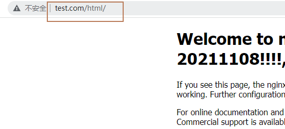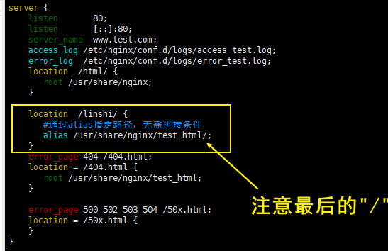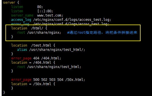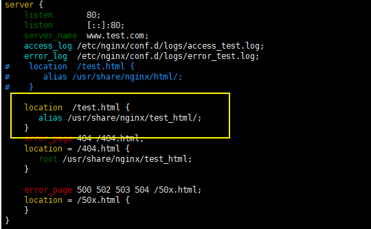 二、验证: 1、精确匹配: 在conf.d文件夹下创建配置文件test.com.conf,内容如下: 上图中第一个和第二个location匹配条件一样,都是/test.html,但第二个为精准匹配到静态路径,因此第一个不会执行,会执行第二个,www.test.com为本地域名解析,access_log和error_lor可以单独为每个模块定义日志 通过域名和路径访问后的内容如下: 注意:路径/usr/share/nginx/test_html文件夹下需要有test.html才可以正常访问 上图中指定静态资源路径用的关键字root,还可以用alias,那么root和alias的区别是什么?