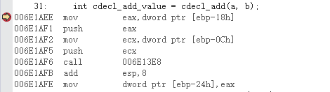 可以看到,cdecl,stdcall是通过压栈的方式将参数压入栈中,而fastcall直接赋值给寄存器,并无压栈操作