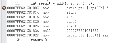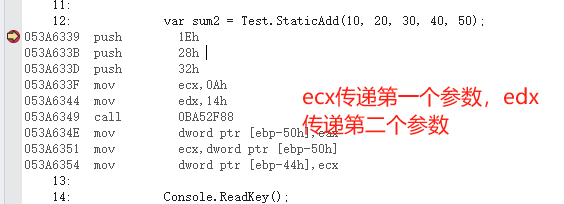 注意寄存器与栈是两片独立运行的区域,光从汇编代码,很容易陷入误区,就拿上图来说,从上往下阅读汇编,你会发现参数传递的顺序是30(1Eh),40(28h),50(32h),10(0Ah),20(14h)。明显不对,这是因为一个是寄存器,一个是线程栈,这是两个不相关的区域,谁前谁后都不违反从左到右的规定。不能死脑筋,寄存器与栈之间是存在位置无关性的。
