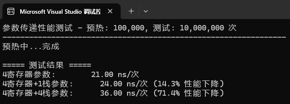 Console.WriteLine($"4寄存器+1栈参数: {stack1Time,10:N2} ns/次 ({((double)stack1Time / reg4Time - 1) * 100:F1}% 性能下降)");