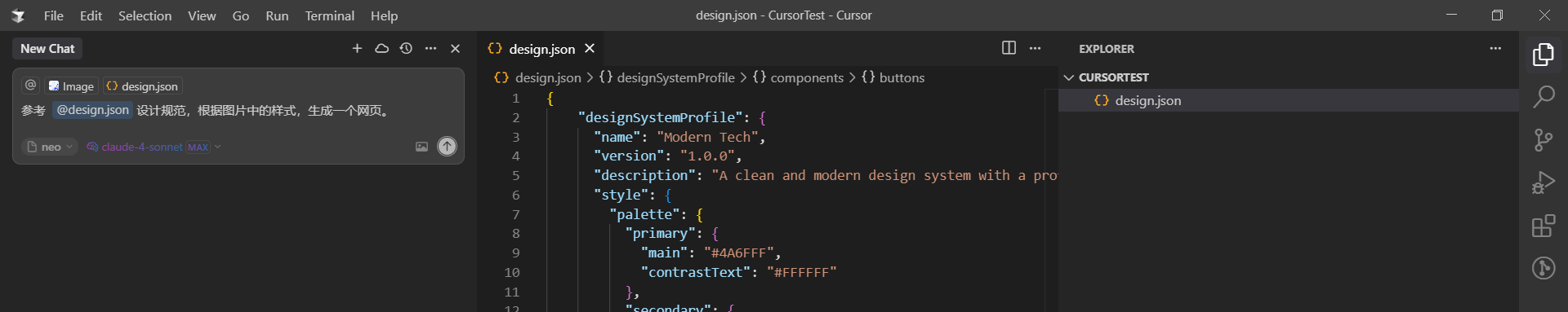 生成出来的 JSON 包含整体设计风格、结构元素、布局原则,以及一些关键属性。 接着把这份 JSON 文件复制到 Cursor 中,让 Cursor 根据这份 JSON 来生成代码。 提示词参考: