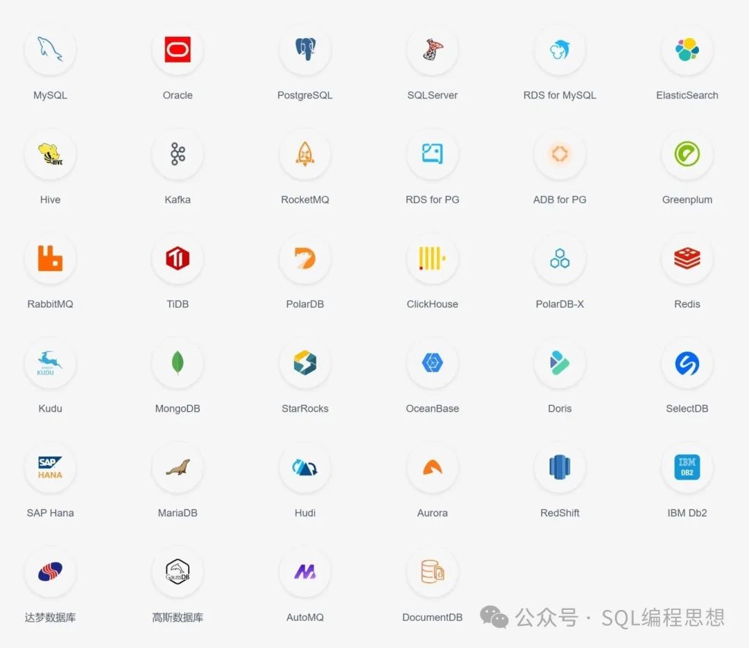 CloudCanal 目前已经支持的数据源包括:MySQL、Oracle、PostgreSQL、SQL Server、RDS for MySQL、ElasticSearch、Hive、Kafka、RocketMQ、RDS for PG、ADB for PG、Greenplum、RabbitMQ、TiDB、PolarDB、ClickHouse、PolarDB-X、Redis、Kudu、MongoDB、StarRocks、OceanBase、Doris、SelectDB、SAP Hana、MariaDB、Hudi、Aurora、RedShift、IBM Db2、达梦数据库、高斯数据库、AutoMQ、DocumentDB 等。
