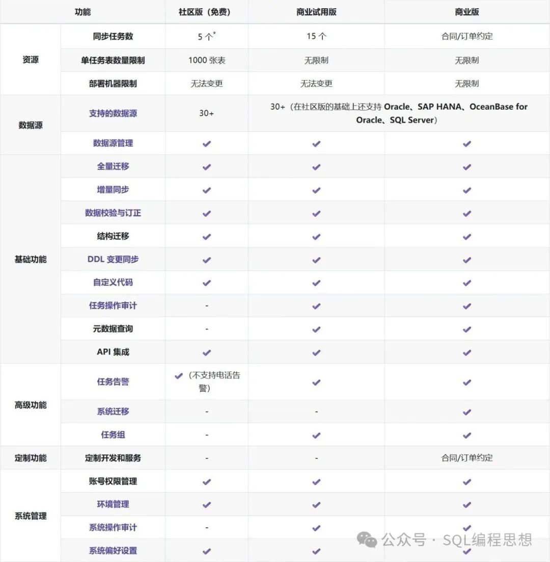 • 实时高效 :数据同步功能延迟普遍小于 5 秒 , 期间完成增量数据解析、攒批、操作过滤、数据转换、元数据映射、数据写入等动作。 • 精确互联 :对于数据链路两端的数据类型、结构规范、读写特点做了精确匹配与转换,让每一个数据源种类、版本差异 得到妥善解决。 • 稳定可扩展 :产品内核精简,单进程架构,系统分布式、高可用部署。产品通过组合各个职能的任务进程,实现大规模、分布式、高质量数据管道集群。 • 一站式 :汇集结构迁移、数据迁移、数据同步、数据校验与订正、修改订阅等功能,通过有限状态机让功能自动流转和运行。一站式支持用户数据准备与长期同步过程的一系列工作。 • 混合部署 :支持各个公有云、本地机房私有部署,首要关注用户数据安全,有效支持异地、云上云下、多云之间数据安全同步需求。 • 复杂数据转换 :产品默认包含元数据映射、裁剪、过滤等标准能力,同时支持 用户上传业务代码 进行数据复杂处理。 版本对比 CloudCanal 目前提供三种版本的产品,分别为社区版、商业试用版、商业版,三种版本的特点与功能对比如下: