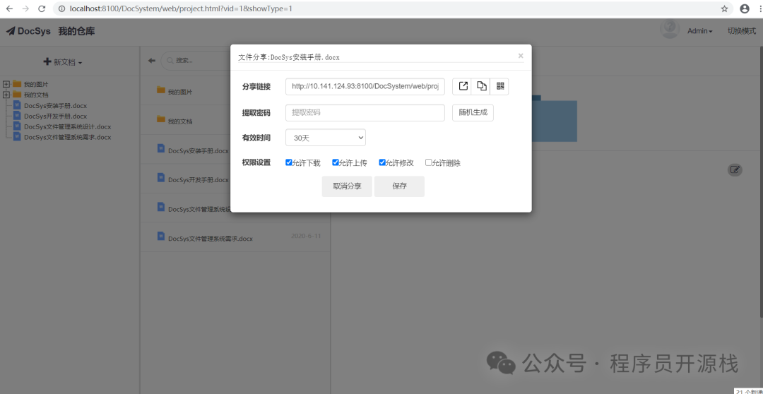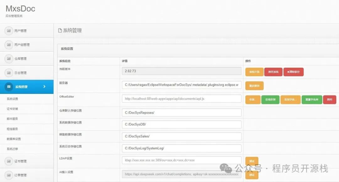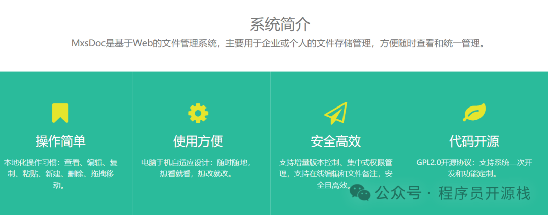整个系统模块化设计清晰,便于功能扩展和维护。 项目体验 项目效果部署完成后,用户可以通过浏览器访问 MxsDoc 的 Web 管理界面,进行文件上传、下载、编辑、分享、搜索等操作。 系统界面简洁直观,操作逻辑清晰,即便是初次使用的用户也能快速上手。文件管理功能完善,支持多仓库管理,每个仓库可独立配置权限、加密策略、备份规则等。 在协同办公方面,Office/WPS 文件的在线预览和编辑功能非常实用,无需依赖本地软件即可实现多人协作。AI 功能的接入也使得知识库内容的搜索与处理更加智能化。 集群部署的支持,使得系统在企业级应用中也具备良好的扩展性和稳定性。 多仓库支持支持定义各自的文件存储、版本管理、权限管理、全文搜索和文件加密规则 存储更安全本地化文件存储方案,避免系统意外损坏对仓库文件造成影响 历史版本采用目前最流行的SVN和GIT版本仓库,支持增量历史版本管理,支持脱离MxsDoc系统进行访问 在线编辑支持各种文本文件在线编辑,支持Office/WPS文件协同编辑,无任何外部依赖(无需安装和部署其他Office编辑软件或系统) AI大模型接入支持接入Deepseek、Ollama等多种AI大模型,让知识库更加智能 文件分享支持文件和目录分享,支持访问权限设置和密码访问控制 全文搜索支持文件名、文件备注、文件内容搜索,让文件查找更加快捷方便 后台管理支持用户管理、用户组管理、仓库管理、系统管理 集群部署支持热插拔式集群,服务器可随时加入或退出集群,支持参数一致性检测,无需人工检查 项目源码源码托管在 GitHub 和 Gitee 上,便于开发者下载、学习和二次开发。 GitHub:https://github.com/RainyGao-GitHub/DocSys/releases Gitee :https://gitee.com/RainyGao/DocSys 项目包含完整的安装包、升级包和部署说明,适合不同阶段的开发者使用: