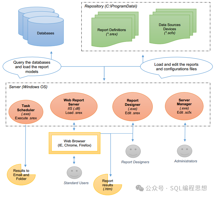 - • 任务调度器(Task Scheduler)按照配置计划自动触发报表的执行、生成输出文件以及执行分发操作。