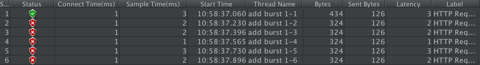我们加入了burst=4,意思是每个key(此处是每个IP)最多允许4个突发请求的到来。如果单个IP在10ms内发送6个请求,结果会怎样呢?