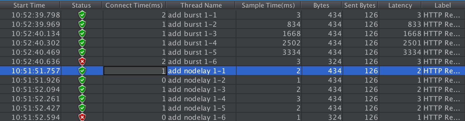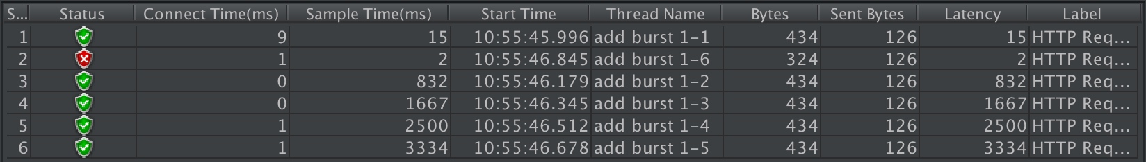 跟实例二相比,请求成功率没变化,但是总体耗时变短了。这怎么解释呢?实例二中,有4个请求被放到burst队列当中,工作进程每隔500ms(rate=2r/s)取一个请求进行处理,最后一个请求要排队2s才会被处理;实例三中,请求放入队列跟实例二是一样的,但不同的是,队列中的请求同时具有了被处理的资格,所以实例三中的5个请求可以说是同时开始被处理的,花费时间自然变短了。