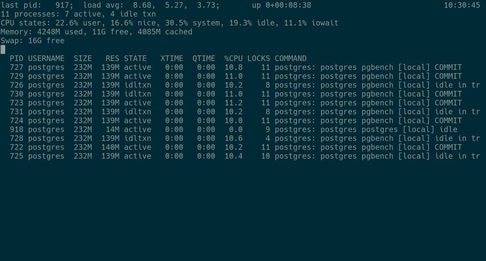 因此,回到数据库自身,是否有类似的负载指标?很可惜,原生 PostgreSQL 并没有类似这样的指标,但是我们知道,一些 CLI 工具是包含 LOAD 这个指标的,比如 pg_top、pg_activity、pg_views 等等。以 pg_top 为例: