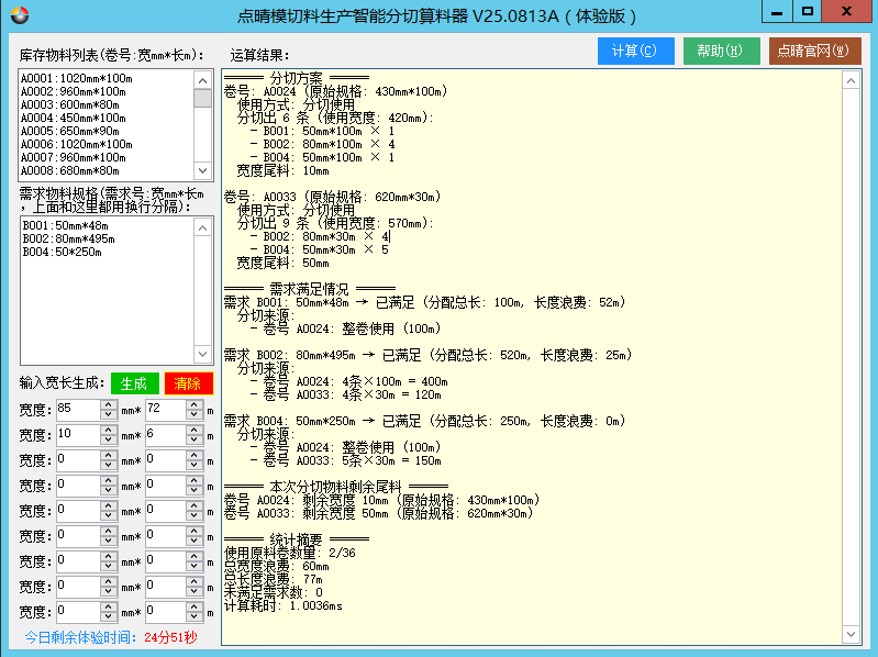 点晴ERP模切料生产智能分切算料器,是深圳市点晴信息技术有限公司专门为模切行业推出的一款模切材料生产分切管理智能算料的程序(从点晴模切ERP系统生产版中剥离出来为一个可以独立运行的程序),可以快速高效的给出最佳分切用料结果,实现最小分切卷数、最少浪费的目标。支持逾万个原始在库物料规格设置、数千个不同规格的生产物料需求在毫秒级内得出最优用料分切结果,欢迎模切行业人士体验试用。