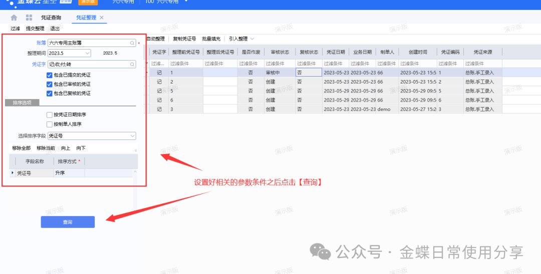 1、使用有权限的用户登录金蝶云星空,进入【财务会计】-【总账】-【凭证查询】,点击【业务操作】-【凭证整理】进入【凭证整理】的界面,设置左边对应的参数之后点击【查询】,即可按照设置的条件信息查询出来参与整理的凭证显示在右边