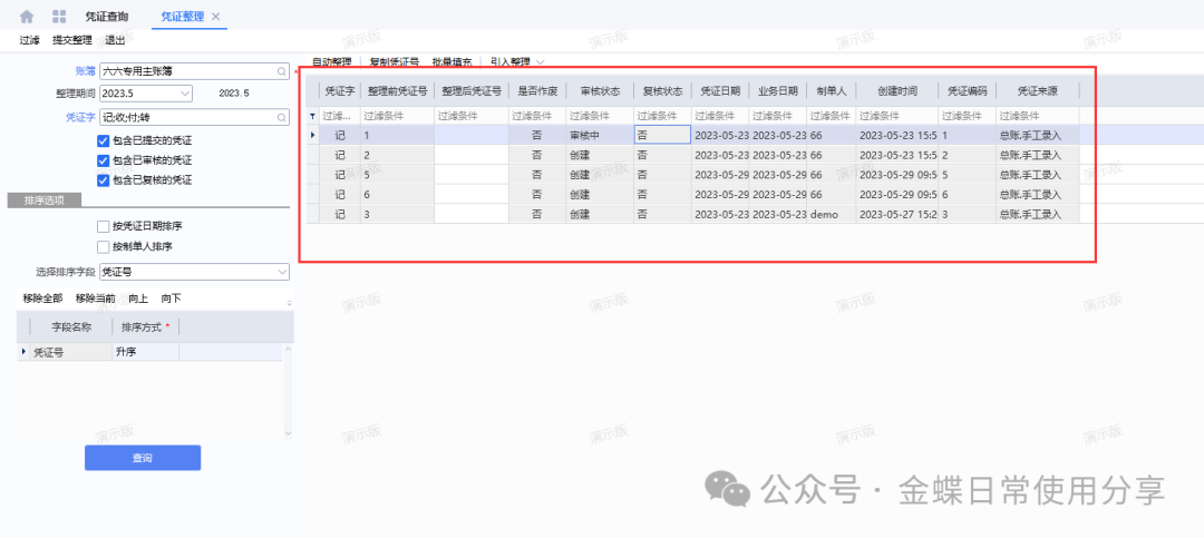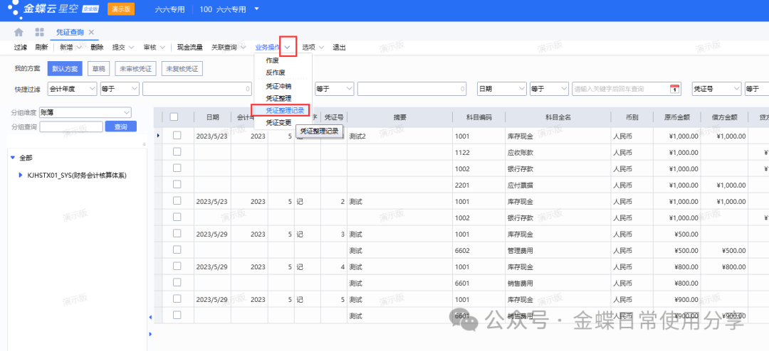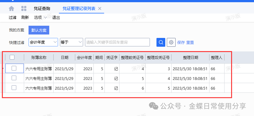 3、凭证整理后系统自动记录整理过的凭证信息,通过【凭证整理记录】可以查看哪些凭证被整理过,以及整理前后的凭证号、整理人和整理时间等相关。