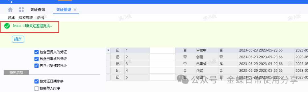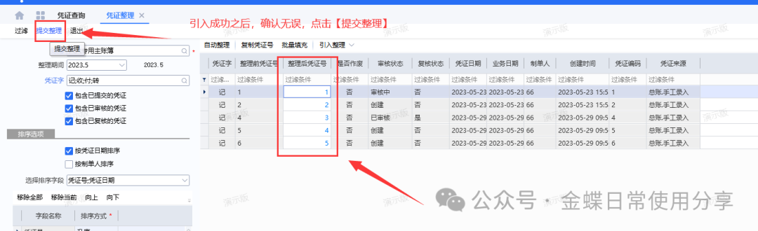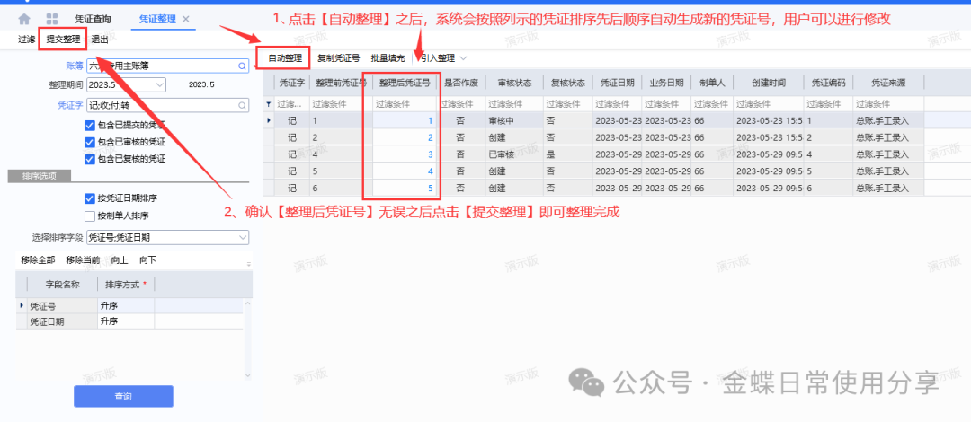 1)、自动整理:点击“自动整理”,系统将自动将当前的过滤出来的凭证列示数据自动生成【整理后的凭证号】,用户可以手工修改调整,如果确认无误之后,点“提交整理”即可。