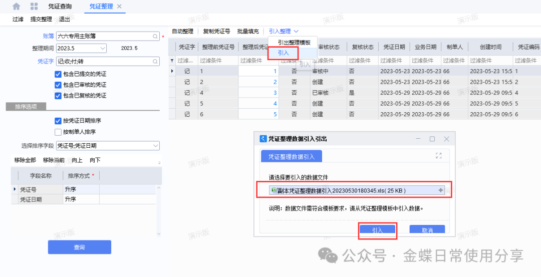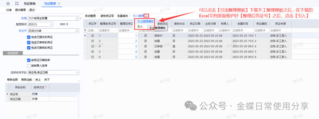 2、手工整理:在凭证整理界面,点击【引入整理】-【引出整理模板】,下载模板之后维护【整理后凭证号】,然后在整理界面点击【引入整理】-【引入】,系统在界面显示引入的整理结果,用户点击“提交整理”即可。
