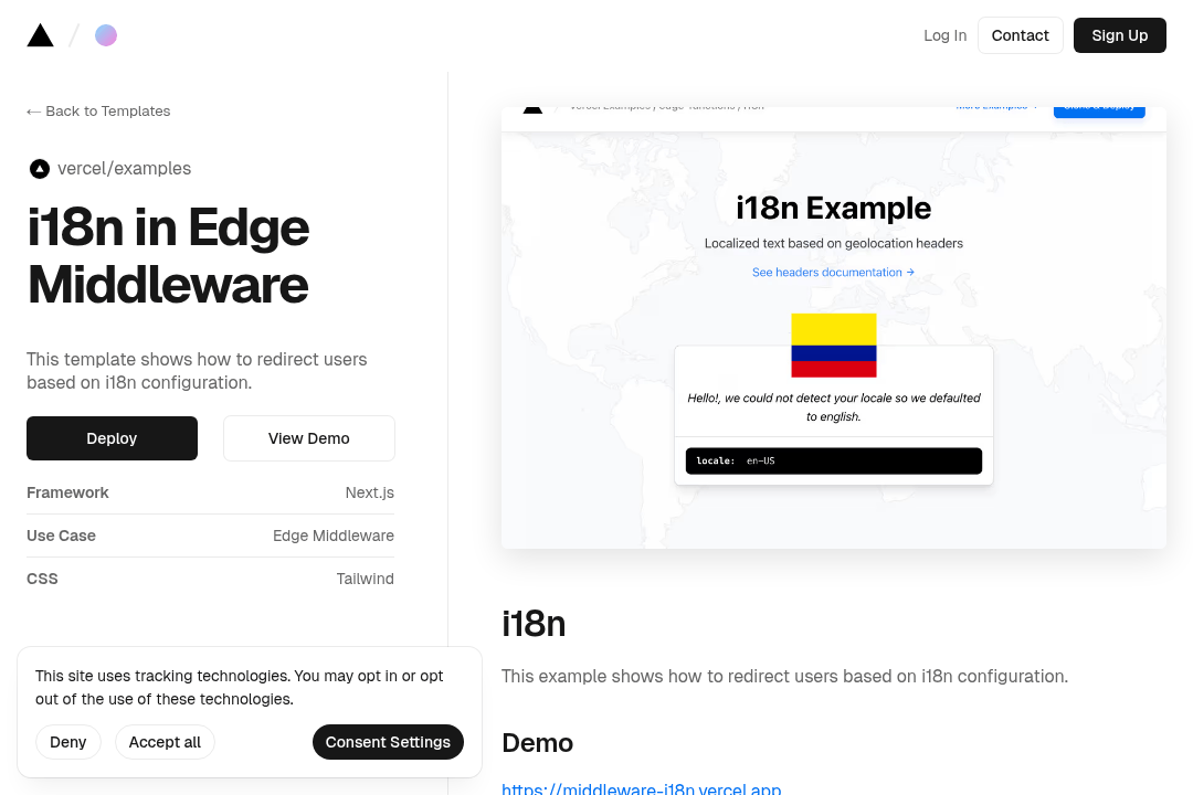 项目简介这个项目叫【i18n in Edge Middleware】,是一个基于Vercel边缘中间件的多语言自动重定向解决方案。它能根据用户浏览器的语言设置,自动跳转到对应的语言版本。比如你的浏览器设置是中文,访问网站时就会自动跳转到中文界面;如果是英文浏览器,就直接展示英文版本。