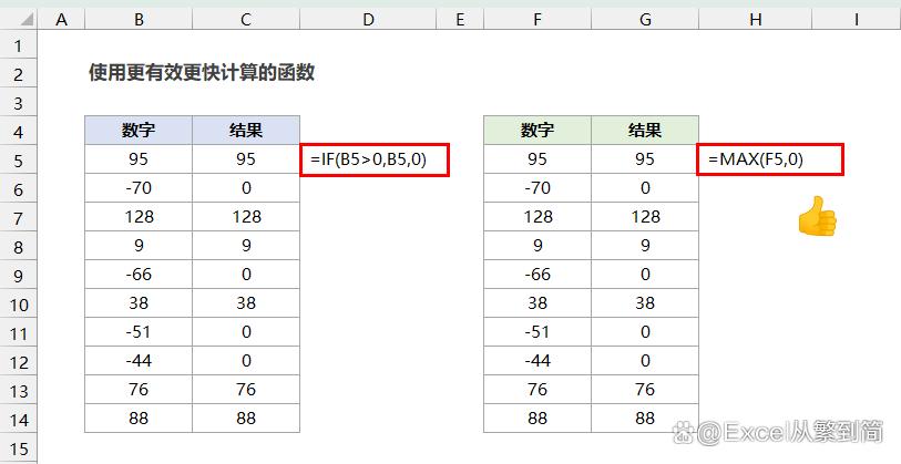 有时还可以用更快、更简单的函数,来加速公式的计算。例如使用 MAX 函数代替 IF 函数检查数字是否为正数。
