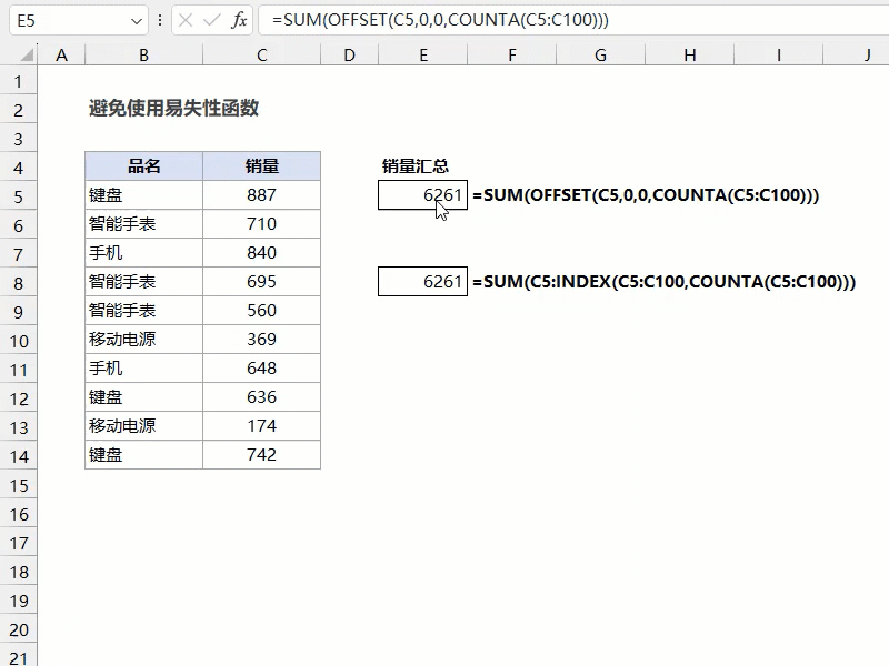 即使你正在做一些“无辜”的事情,比如在不相关的单元格中输入值,删除或插入行或列,过滤,重命名或移动工作表,这些易失性函数都会重新计算,消耗资源。如果你的文件速度变慢,请注意可能是它们的原因。