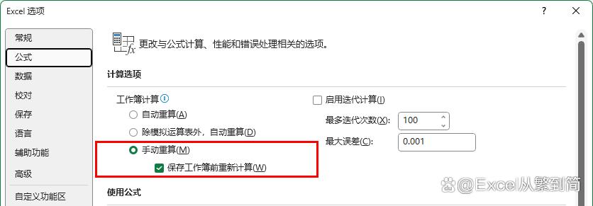 还可以通过转到“文件”>“选项”>“公式”>“计算选项”来确保启用“保存前重新计算工作簿”。