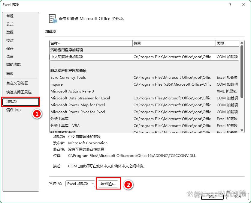 1、若要禁用 Excel 加载项,请转到“文件”选项卡,选择“选项”,单击“加载项”,然后单击“转到…”按钮。