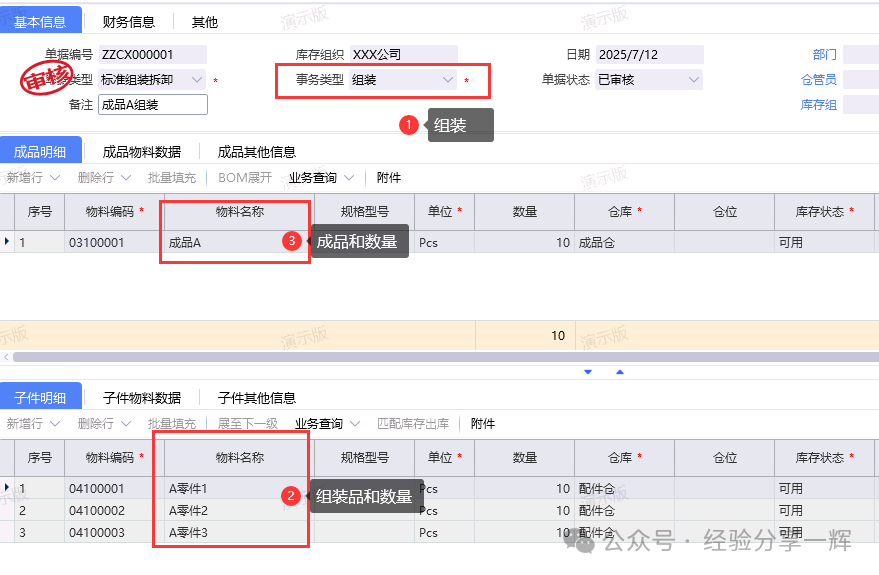 组装单事务类型(组装)(例如:A零件1+2+3,各10个,配件仓),组装成(成品A,10个,成品仓)审核确认后触发库存调整。