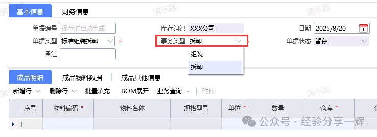 拆御单:事务类型(拆御),把成品拆成子件,更新库存。