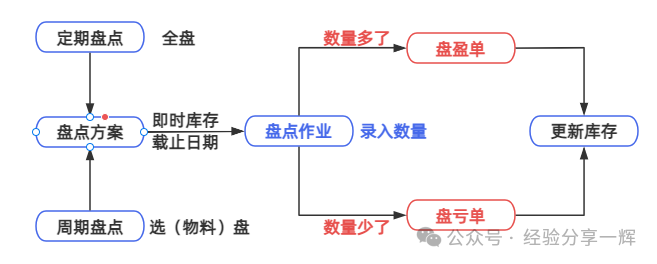 流程:新增盘点方案--(实地盘点)--盘点作业(录入数量)--根据差异自动生成《盘盈单》《盘亏单》审核确认后触发库存调整。