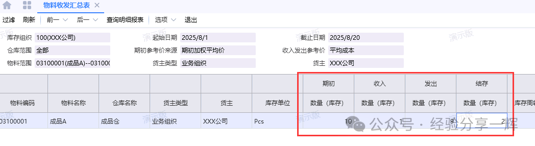 举个例子:查物料(成品A)8月的出入库数据。