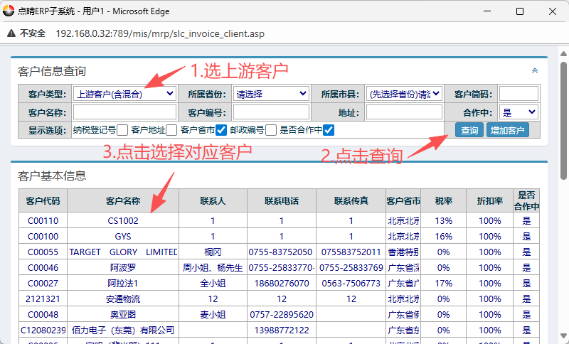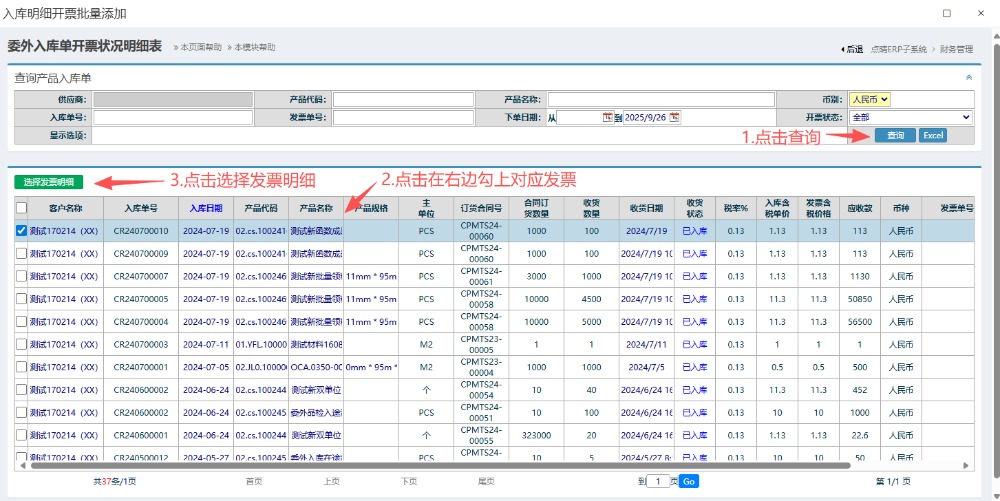 5.提交之后,可以到左侧功能菜单里找到“委外入库发票管理” 点击进入后,按图操作:点击查询,就能看到刚才提交的发票信息明细。 点晴模切ERP更多信息:http://moqie.clicksun.cn,联系电话:4001861886 该文章在 2025/9/26 10:08:25 编辑过 |