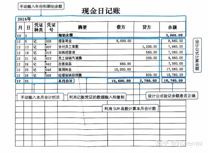将本月发生的经济业务登记到现金日记账后,需要进行本月合计。计算本月借方发生额与贷方发生额的合计数,可以利用SUM函数来完成。每月库存现金的最终的余额,则可以利用另一种公式来计算,从而达到验证余额是否正确的目的。