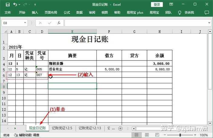 (1)切换到“现金日记账”工作表;(2)在第5行中依次输入所查看的记账凭证中的日期、类型和编号等数据。输入凭证号之前,应首先将单元格的类型更改为“文本”型数据。