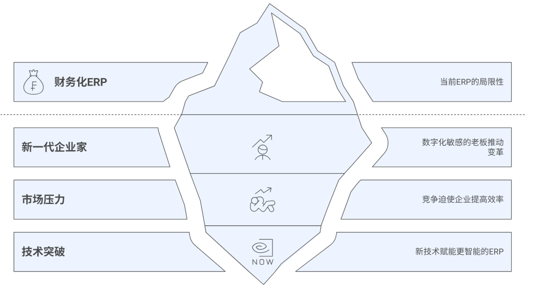 干了这么多年ToB,也算是见证了国产ERP的成长——从早期简单的电算化,到后来对标国际巨头提出“业财一体化”、“全流程管理”、“企业数字神经中枢”……等。