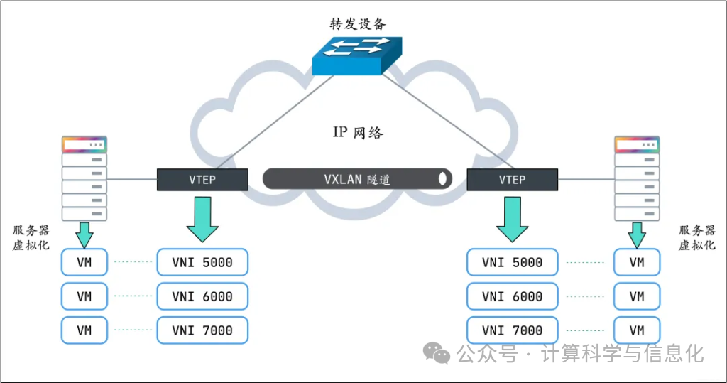 VXLAN 为服务器虚拟化提供了灵活的网络扩展能力。它通过 VTEP(虚拟隧道端点) 将虚拟机的二层流量封装在 UDP/IP 报文中,使虚拟机可以在三层网络范围内自由迁移,同时保持网络策略不变。结合 VNI(虚拟网络标识),VXLAN 能在同一物理网络上创建多个隔离的虚拟网络,满足多租户需求。这种技术使云计算平台(如 OpenStack、VMware)能够动态调配虚拟机,突破传统 VLAN 的数量和地理限制,实现高效资源管理。