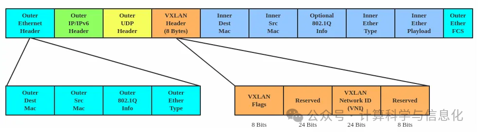 VXLAN Header是封装在原始以太网帧前的8字节协议头,核心字段包括24位VNI