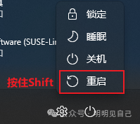 1. 按「开始菜单→电源键」,按住 Shift 键点 “重启”,进入系统修复界面;