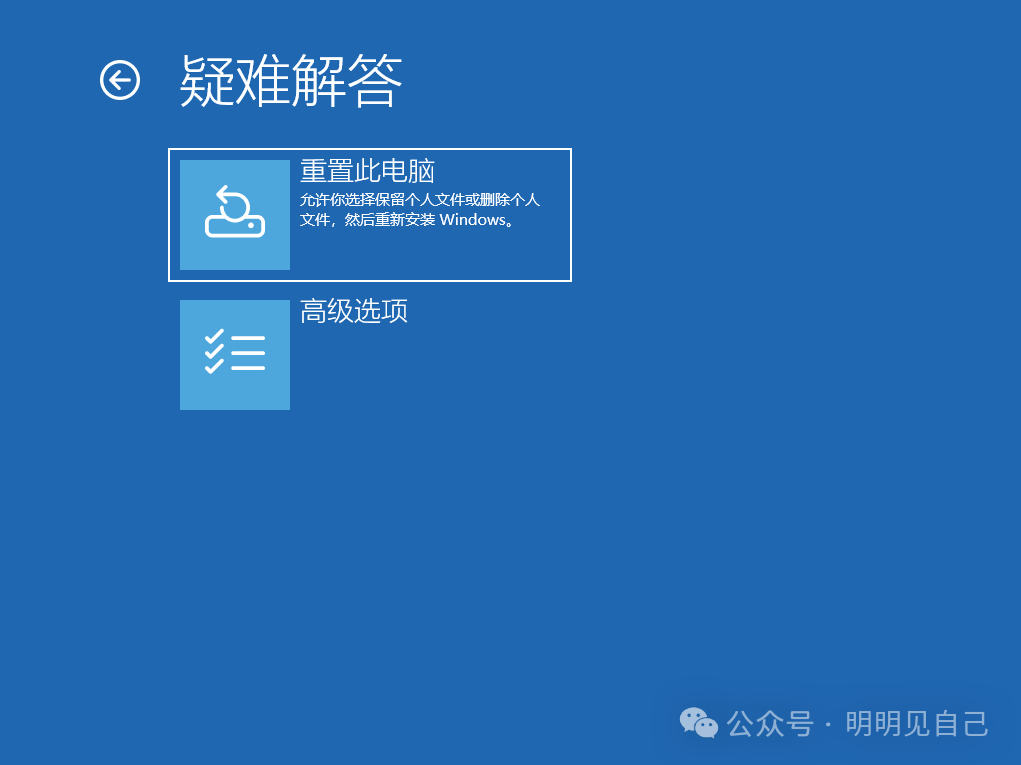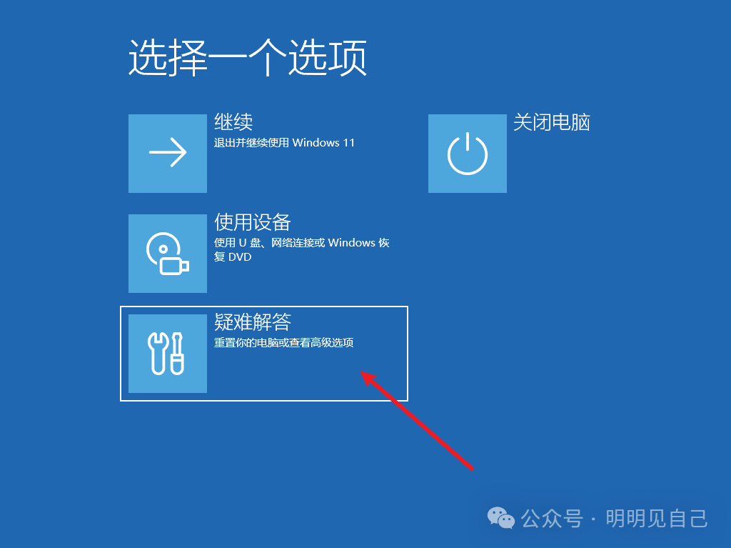 1. 重启的时候会进入系统维修界面,点击疑难解答