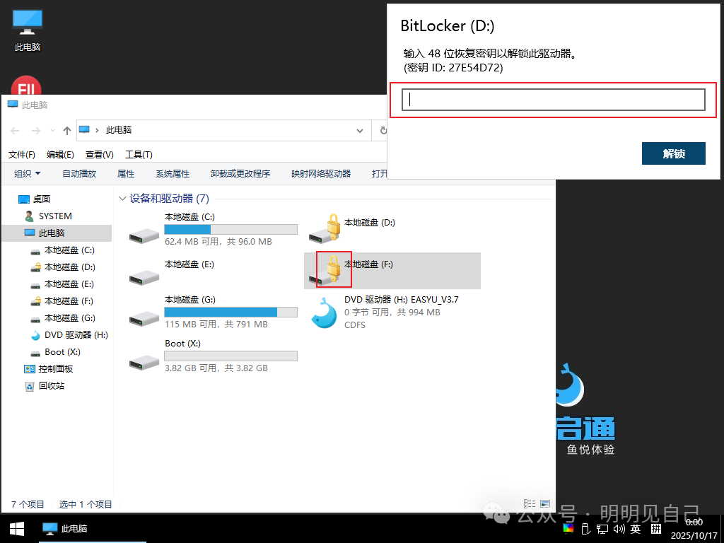 如果电脑开不了机,想用 PE 盘(U 盘启动盘)读 C 盘数据,会发现 “磁盘显示加密,读不了”—— 这是 BitLocker 的保护机制,必须先解锁: