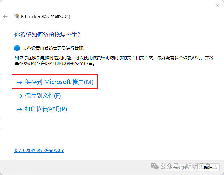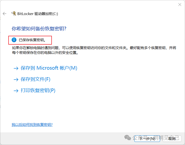 1. 第一步先备份恢复密钥 ——强烈选 “保存到 Microsoft 账户”(丢了还能在aka.ms/myrecoverykey 找,别选 “保存到文件”,容易删丢)。
