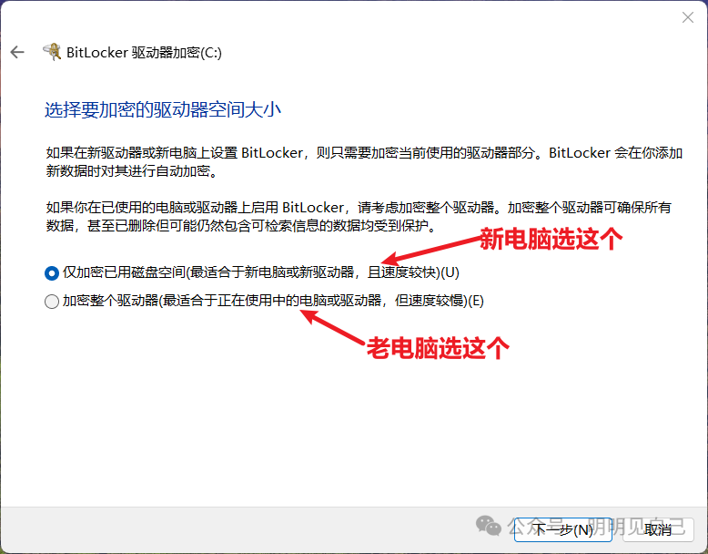 • 新买的电脑 / 刚装的系统:选「仅加密已用磁盘空间」(快,10 分钟搞定);