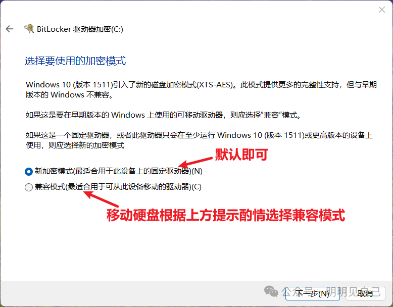 1. 加密模式默认「新加密模式」就行(兼容性好);如果是加密移动硬盘,要在 Win7 上用,就选「兼容模式」。