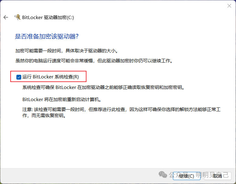1. 勾选运行BitLocker系统检查,点击继续