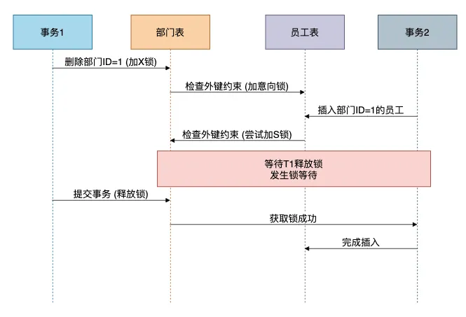INSERT INTO employee (name, department_id) VALUES ('新员工', 1); -- 等待锁