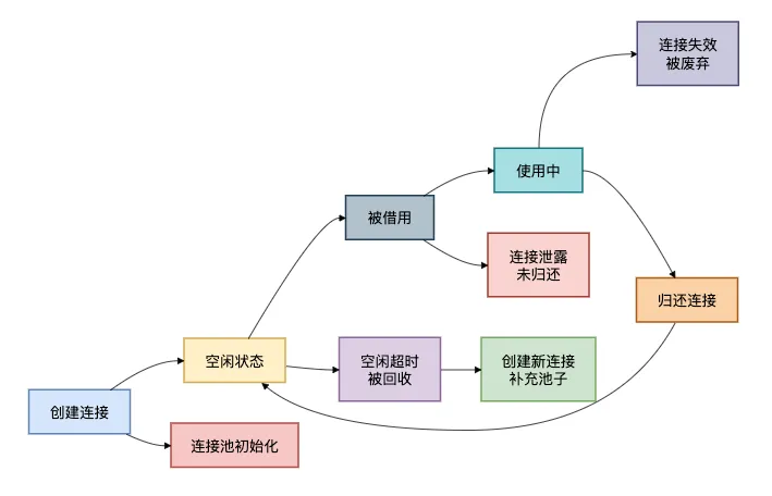 为了理解连接池的工作机制,我画了一个连接池状态转换图: