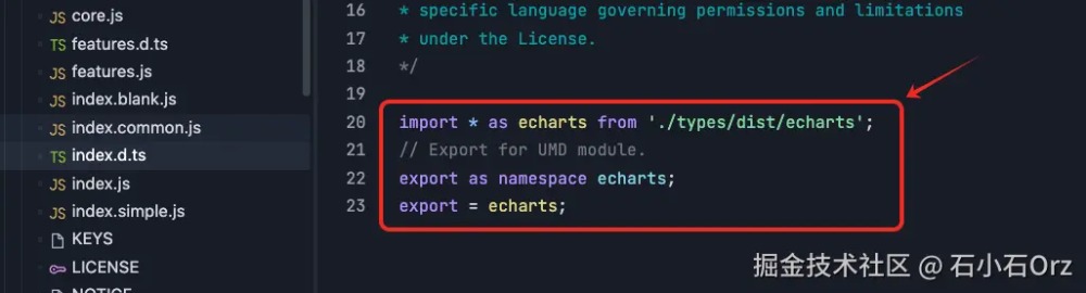 熟悉完ES6的import的命名空间导入用法,我想echarts为什么需要通过import *答案已经很明确了。我们来看看echarts的入口文件: