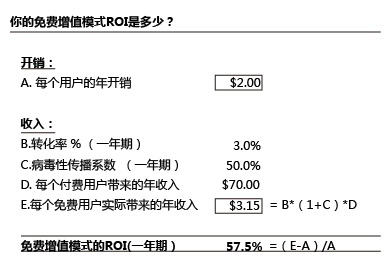 通过对比你为服务这部分免费用户花费的成本,和你通过这部分人带来的付费用户中获取的收益,你可以计算出免费增值的ROI(看下面这个假设案例):