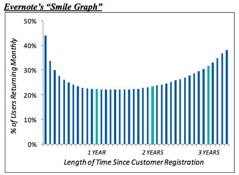 案例:Evernote。在第一天,一个新的Evernote用户看不到什么存储内容,而他唯一能做的是创造新的内容出来。但是,随着这名用户逐渐积累笔记数,他就越有可能会继续回来用这款产品,而且还会尝试不同的方法跟这类历史数据互动。三年后,一个Evernote用户从这款产品中获得的价值跟他们使用产品的第一天相比增长了,所以他们回来用这款产品的概率就更大了。尽管大部分产品的用户随着时间的推移对一款产品的使用度在下降,但Evernote的情况却恰恰相反(Evernote的流失率是负增长的,看看下面的笑脸你就知道了)。而随着用户通过他们的免费产品获得越来越多的价值,有些用户最终被转化成付费用户,给Evernote带来了收入。