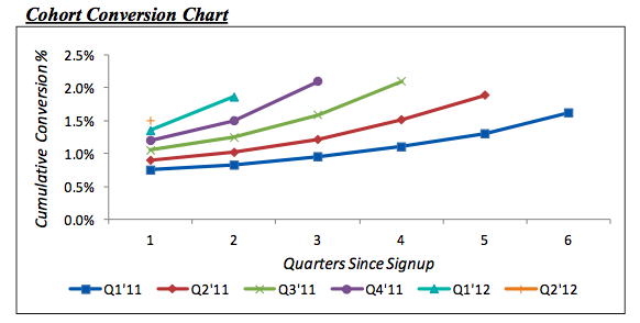 对免费增值模式的公司而言,同期组群数据分析尤为重要。因为从用户注册到用户最终变成付费用户的时间跨度可能很长。在传统的软件授权模式中,客户需要直接付费才能使用软件——然后交易就基本结束。但是在免费增值模式下,一个免费用户可能在好几年之后才变成一个付费用户。那么,这些公司唯一能够评估用户转化是否会如期发生的便是通过跟踪这些数据了。正如一个酿酒师会从酒桶里面尝尝葡萄酒以确保每个年份都没有问题一样,一家公司的高层也需要跟踪这些数据,以确保他的业务已经在逐渐成熟。